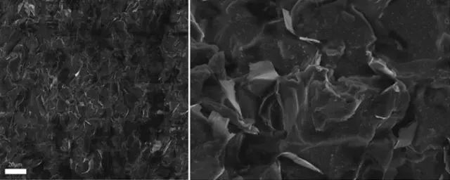 可以看出,这是一种典型的三元复合材料,其中石墨烯海绵相当于骨骼,碳纤维相当于肌肉纤维,而树脂则相当于结缔组织。从显微图可以看出,这种材料的结构是在三维尺度上纵横交错高度融合的,因此它拥有比碳纤维复合材料更好的力学和理化性能是应有之义。