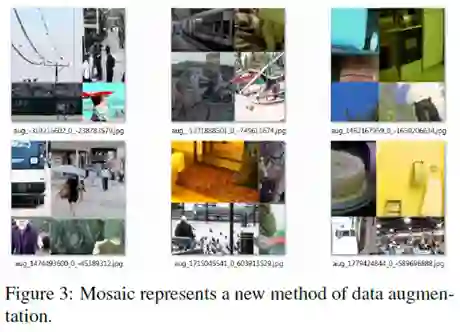 其中马赛克数据增强是一种新的数据增强方法,它是有四张训练数据组合而成,如下图所示: