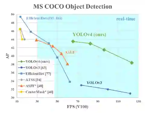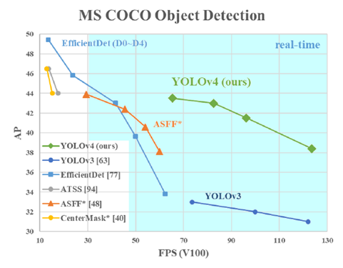 YOLO对象检测模型自问世以来受到计算机视觉开发者的追捧、应用广发,已经陆续发出了三个版本分别是YOLOv1~YOLOv3,现在YOLOv4也出炉了,精度与速度全面超越YOLOv3版本,废话不多说了,有图为证: