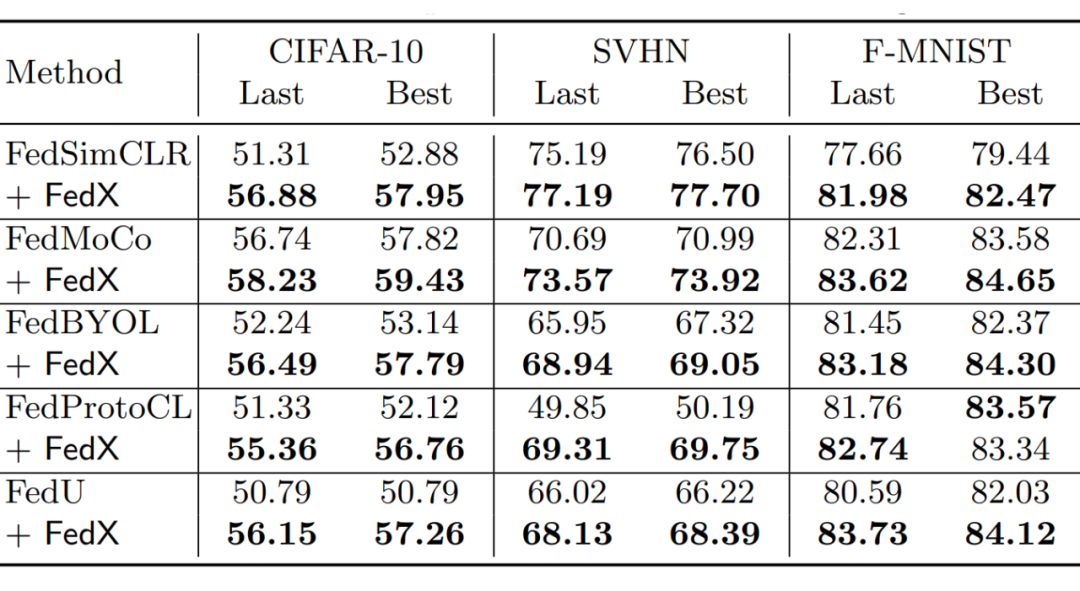 FedX 是一个可以被用于现有联邦学习扩展的算法,提升现有联邦学习算法的性能(1.58-5.52pp),同时对不同客户端的数据严格保密,不(像部分现有的无监督联邦学习算法一样)直接在不同客户端之间进行数据的共享;