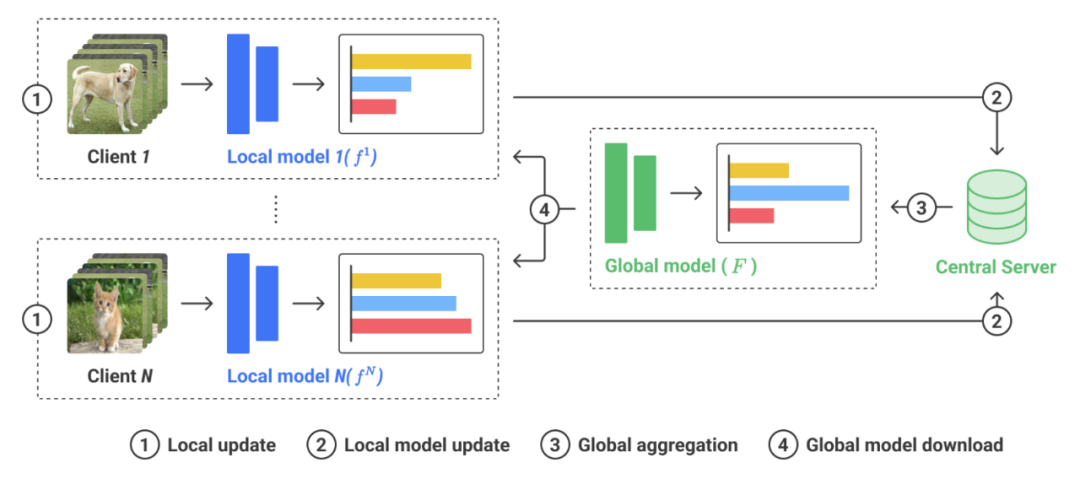 Global aggregation:中心服务器对所有 client 上传的模型进行聚合,最简单的方式是(假设本地模型都是同构的)根据 client 各自拥有样本数量的占比进行加权平均;