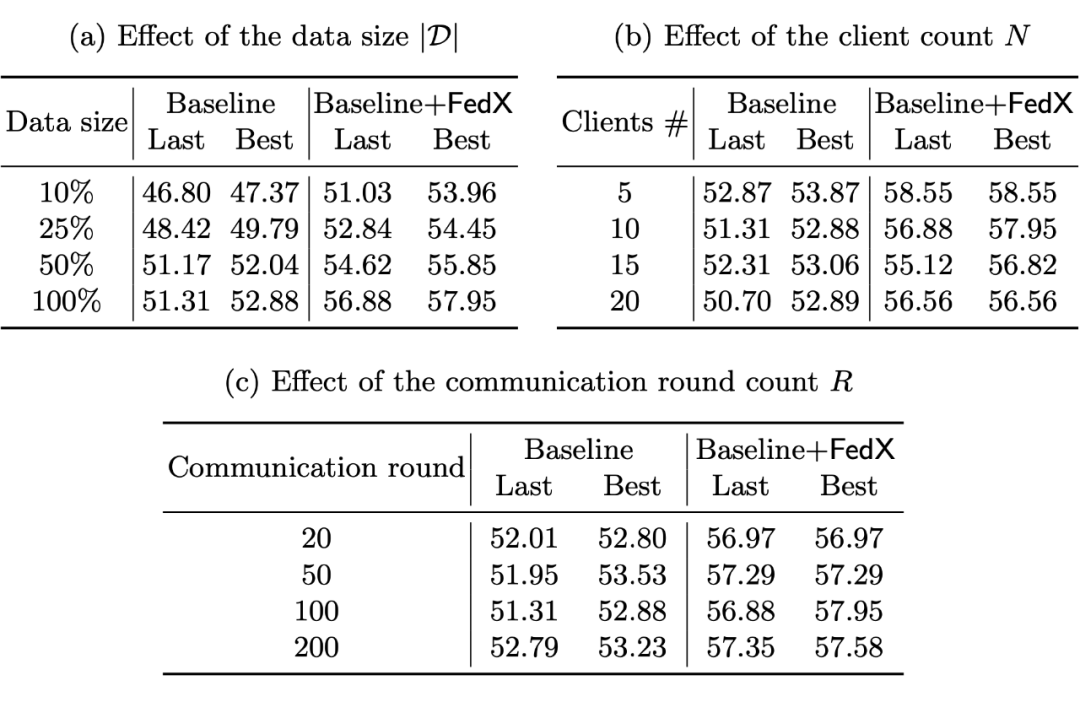 作者也进行了一系列的有效性实验,以证明 FedX 在不同场景,不同设定下的有效性。