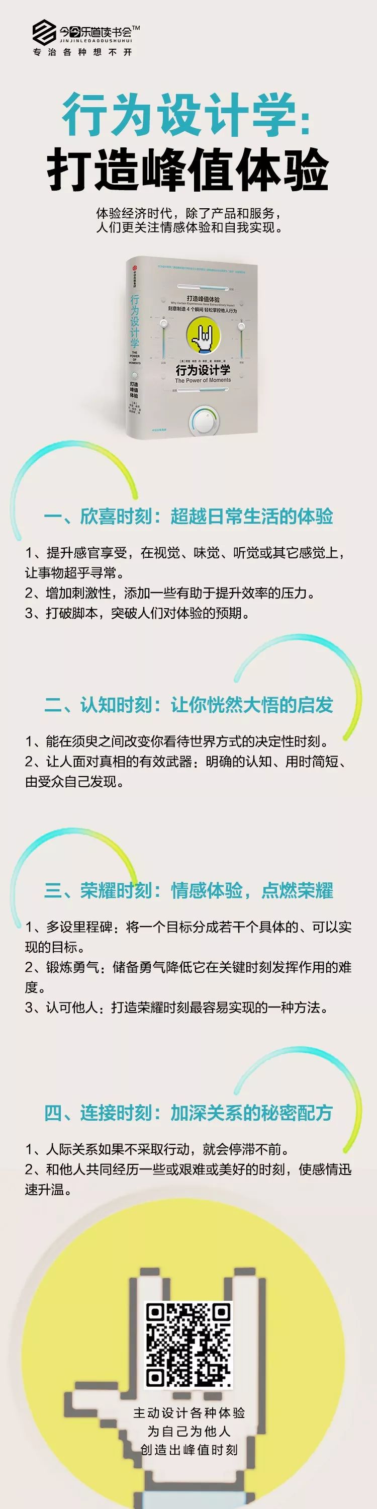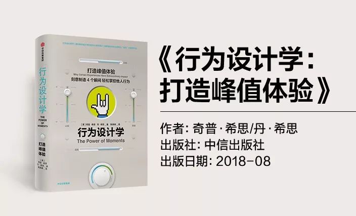 利用好“峰终定律”,为顾客打造峰值时刻,可以为商家带来巨大的商业利益,掌握这些套路,并用来经营个人生活,也会取得令人意想不到的效果。那么,什么是“峰终定律”?如何把“峰终定律”运用在生活和工作中?本书《行为设计学:打造峰值体验》专门来解决这个问题的。这本书的作者是斯坦福大学商学院教授奇普·希思,以及杜克大学社会企业发展中心高级研究员丹·希思,希思兄弟通过研究发现,那些令人难忘的峰值时刻大致包含四种元素:欣喜、认知、荣耀和连接。当我们面对生命中的转变、里程碑时刻和低谷事件时,会本能地渴望关注和重视。这也是体验设计者最值得用心投资的节点,是搭建信任、尊重、责任和忠诚度的最佳时机。结合以上4种体验,凸显转变时刻,纪念里程碑事件,填平低谷感受,就抓住了体验思维的核心。