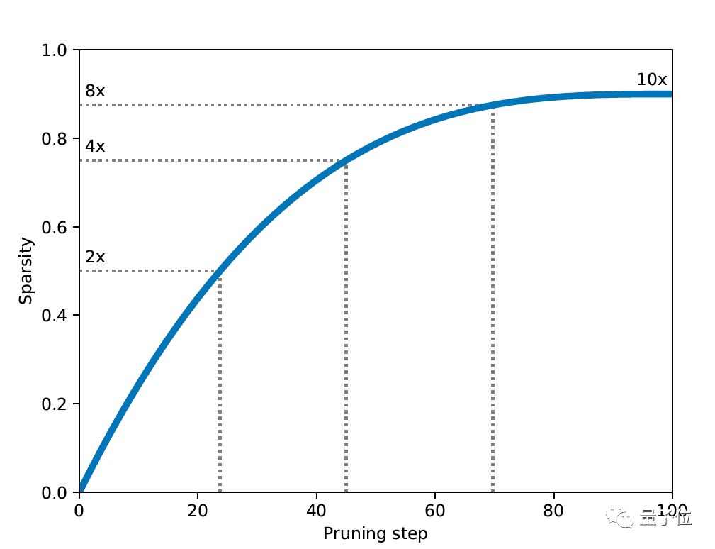 每次计划执行剪枝程序时,都会重新计算当前稀疏度目标,根据平滑上升函数逐渐增加稀疏度来达到最终目标稀疏度,从0%开始直到结束。