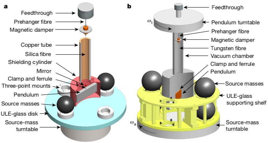 在TOS方法中,板的旋转是振荡的。当外部质量配置不同时,由振荡速度的变化计算出G。而在AAF方法中,使用两个转盘分别旋转扭转平衡秤和外部质量。当光纤的扭曲减小到零时,G由与扭转平衡秤相连的转盘的角加速度来确定。