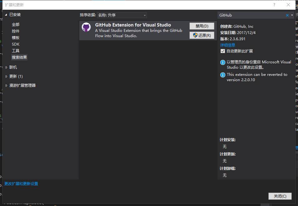 选择 工具-->扩展和更新,搜索GitHub,安装GitHub的VS插件