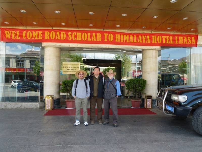 其后我与钟扬见面的次数就多了起来,几乎每年都能见到。特别是2015年5月,由于对西藏的向往,我与我的同事John Spence专门去西藏旅游,一起与钟扬从成都飞拉萨。原本也想去看看他在西藏大学的实验室,但由于对外籍游客的限制,遗憾没能跨进藏大校门,只好在饭店里与他组里的老师和学生做了个交流。正好碰上饭店接待一个“Road Scholar”,趁机合影,自嘲是三个“Road (Rhodes) Scholars” (罗德学者)。