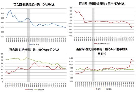 (对比为整合中的附属方数据比上主导方数据,即世纪佳缘数据/百合网数据)