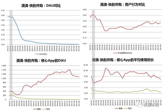 滴滴作为新公司的主导,无论是用户量还是品牌,滴滴用最快的速度(不到6个月)完成了整合以及对快的品牌的彻底消亡。从数据也可以发现,在完成整合之后,滴滴App的DAU和平均用户时长都有明显的提升。
