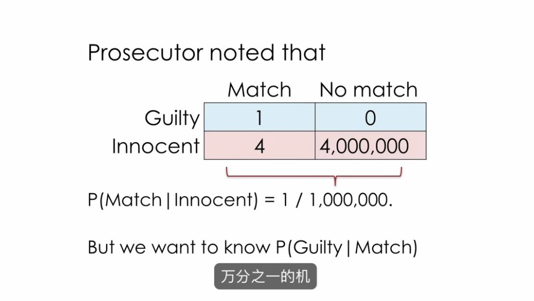 法官说,“当然,DNA 匹配概率是百万分之一。你的当事人是凶手无疑。”