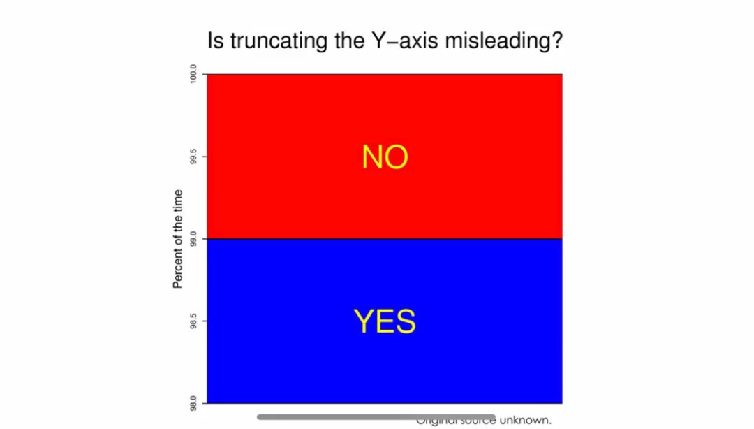 数据可视化可以降低看数据的难度,但是在数据以图表的方式呈现出来之后,我们也需要去关注一些细节——因为图表会给出一些诱导性的表达方式,影响我们判断。比如误导性坐标轴(misleading axes )。