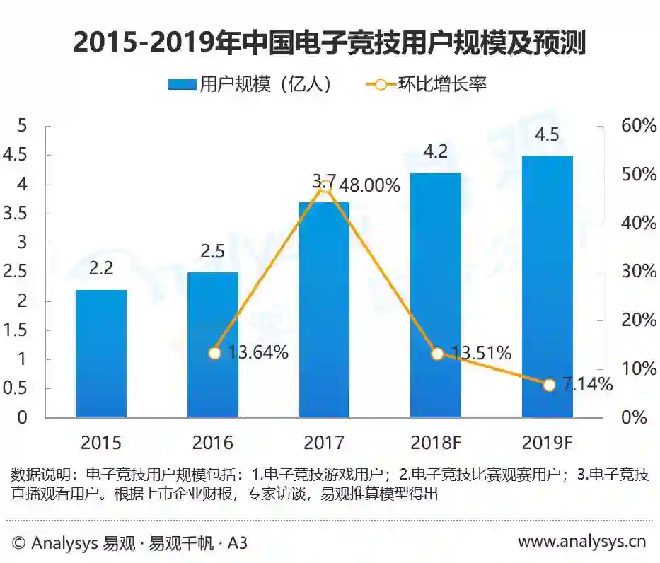 Analysys易观认为,2017年我国电子竞技用户体量将达到3.7亿人,环比增长48%,这主要是由于电竞游戏吸引了大量的新进用户,同时电竞赛事建设也逐渐进入多元化和专业化阶段,促进了用户规模的显著增长。