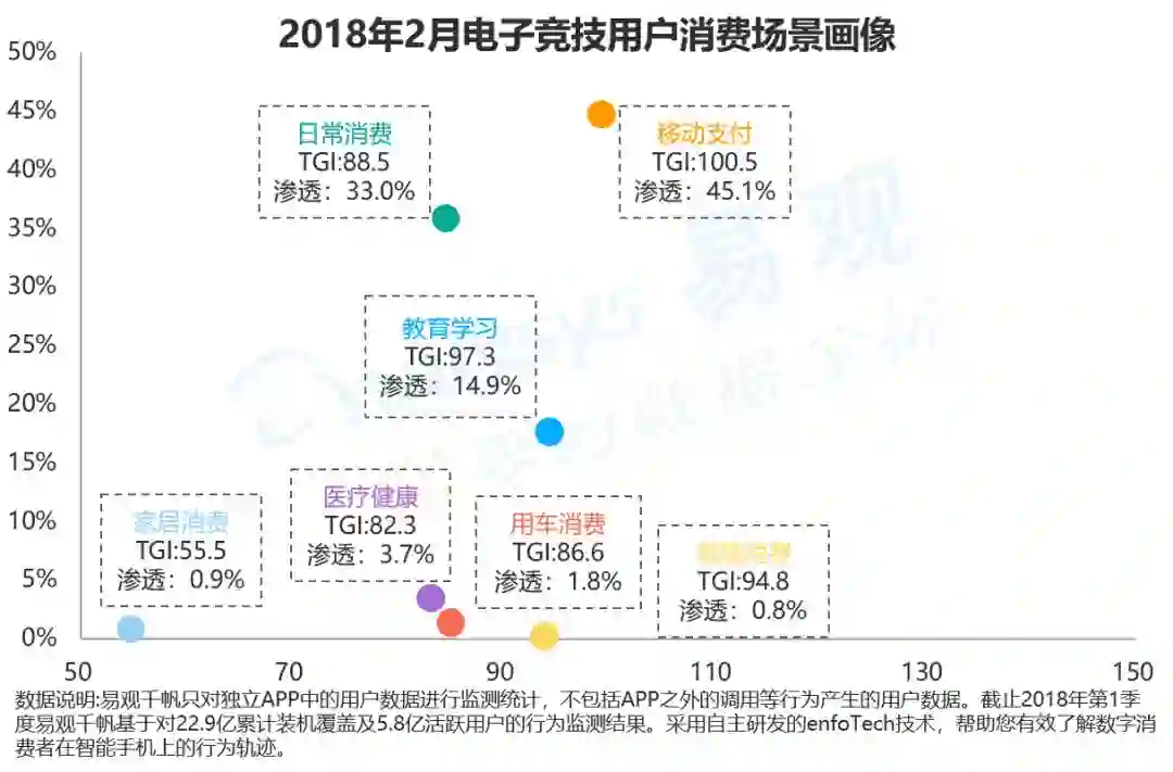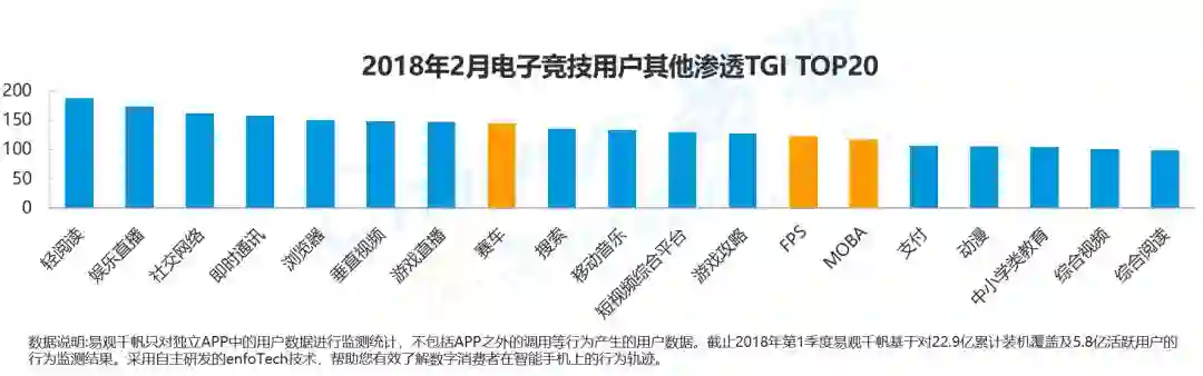 从电子竞技用户对其他领域的渗透TGI可以看出,电子竞技用户在泛娱乐应用中的分布远高于全网平均水平。