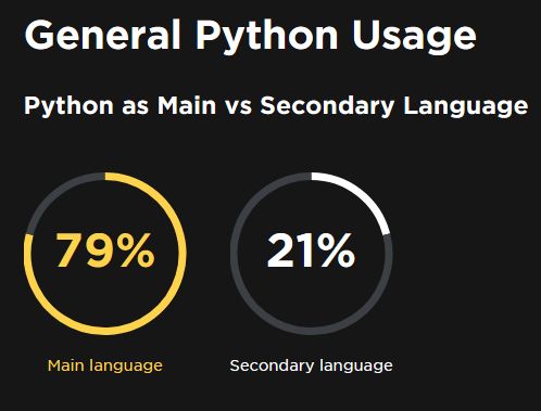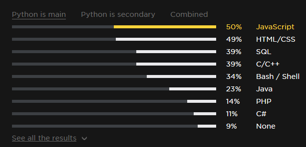 结果显示,有 4/5 的 Python 使用者将 Python 作为他们的主要语言,这 4/5 中又有一半的人还同时使用 JavaScript。