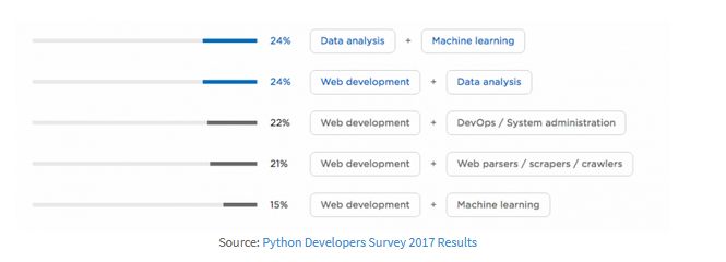 “2017 年 Python 开发人员调查”将数据分析和机器学习结合到一个单一的“数据科学”类别中时,结果显示 27% 的受访者都使用 Python 进行数据科学研究。