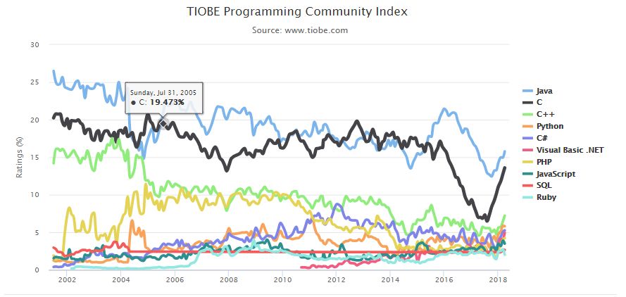Top 10 编程语言 TIOBE 指数走势(2002-2018)