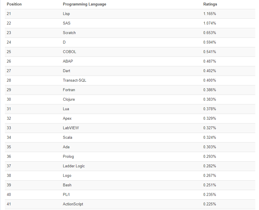 (Visual) FoxPro, 4th Dimension/4D, Applescript, AutoLISP, Avenue, BBC BASIC, bc, Bourne shell, C shell, CFML, CL (OS/400), CoffeeScript, Common Lisp, Crystal, Elixir, Erlang, F#, Forth, Groovy, Hack, Icon, IDL, Io, J, Korn shell, LiveCode, Maple, Mercury, ML, Modula-2, Monkey, MOO, MQL4, NATURAL, NXT-G, OpenCL, OpenEdge ABL, PowerShell, Q, Ring, Rust, Scheme, Simulink, Snap!, SPARK, Standard ML, Stata, Vala/Genie, VBScript, VHDL