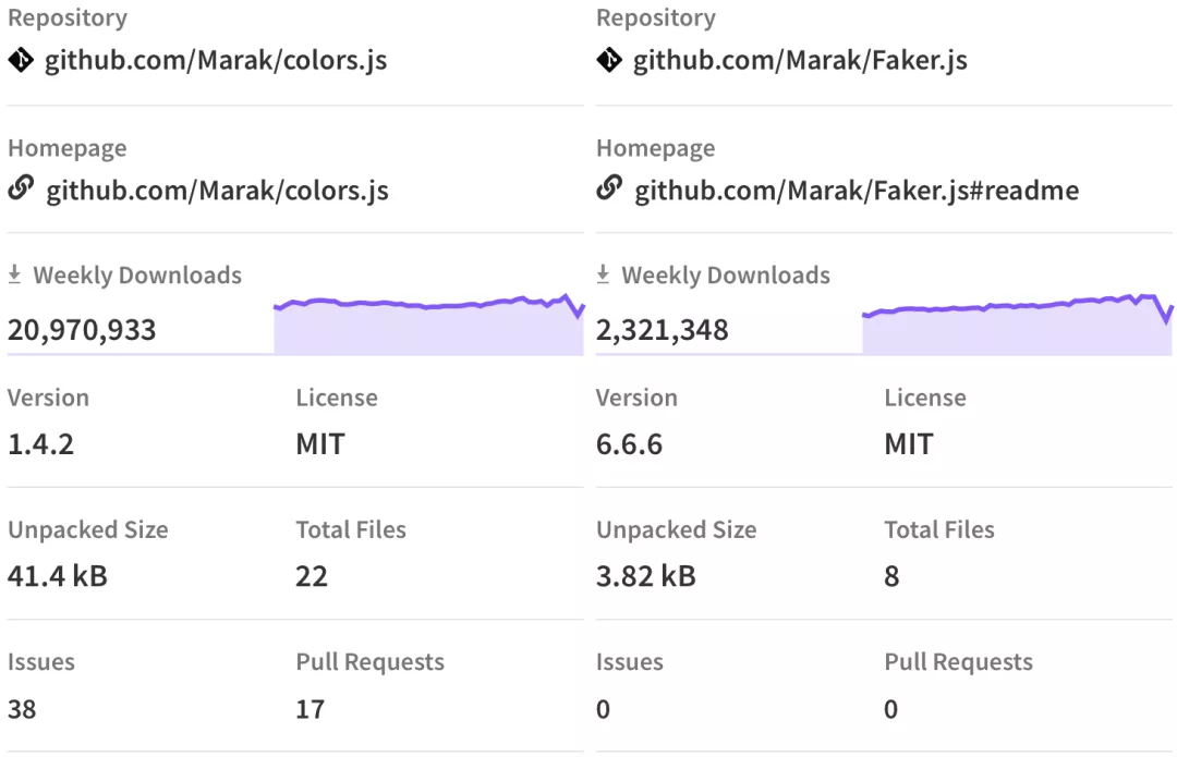作为两个非常受欢迎的开源库,「colors」在npm上每周的下载量就超过2000万次,并且有将近19000个项目正在使用,「faker」在npm上每周的下载量超过280万次,有超过2500个项目使用。