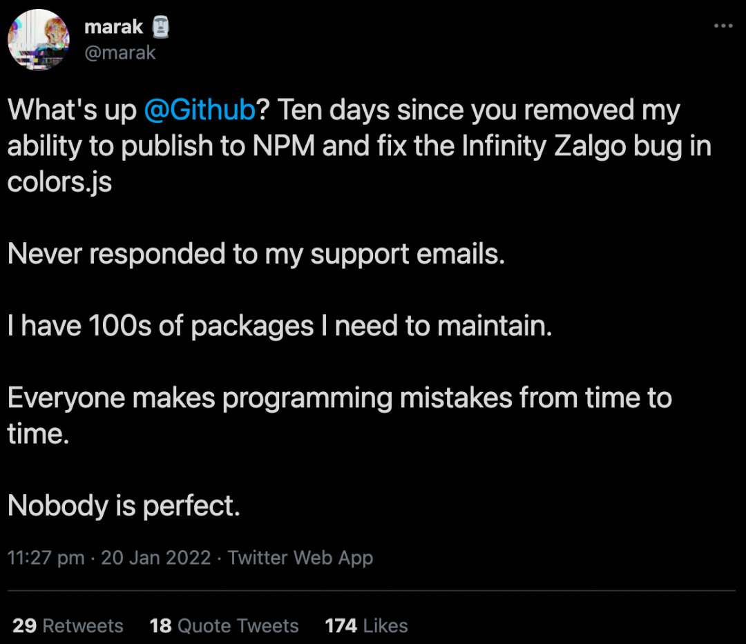 也不知是不是想挽回点名声,Marak在1月15日的时候发文表示自己已经在3天前就修好了程序的「bug」,但因为自己被封了所以没办法上传至NPM。
