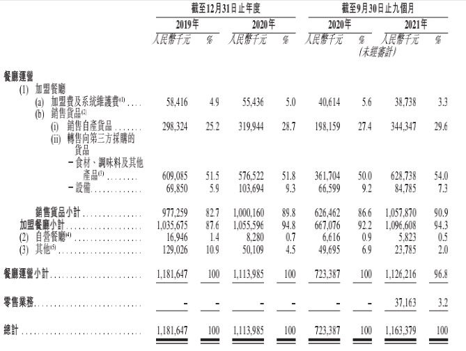 2021年前9个月,“加盟费及系统服务费”占总收入的比例为3.3%;“销售货品”占总收入的比例则为90.9%。