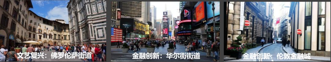 在公元1000年的时候,佛罗伦萨的弯曲小街道就孕育了欧洲的文艺复兴,当时这些小街道集聚了欧洲最牛的思想家、文学家、哲学家、物理学家、天文学家等,文艺复兴就是在这种环境下,通过不同学科进行碰撞交流产生的火花。回过头来看今天,全球最顶级的创新空间在华尔街、在伦敦金融城这些地区。华尔街500米的小街道能实现什么?作为金融从业者,在这里喝咖啡是能够感受到竞争对手在街对面喝咖啡产生的信息存在,这种交流不需要语言,只需要打个照面,一个眼神就知道对手最近在考虑什么,要怎么去应对,该怎么去跟进,这种信息的交换需要街区这种空间,通过亲近的、面对面的方式来实现的。
