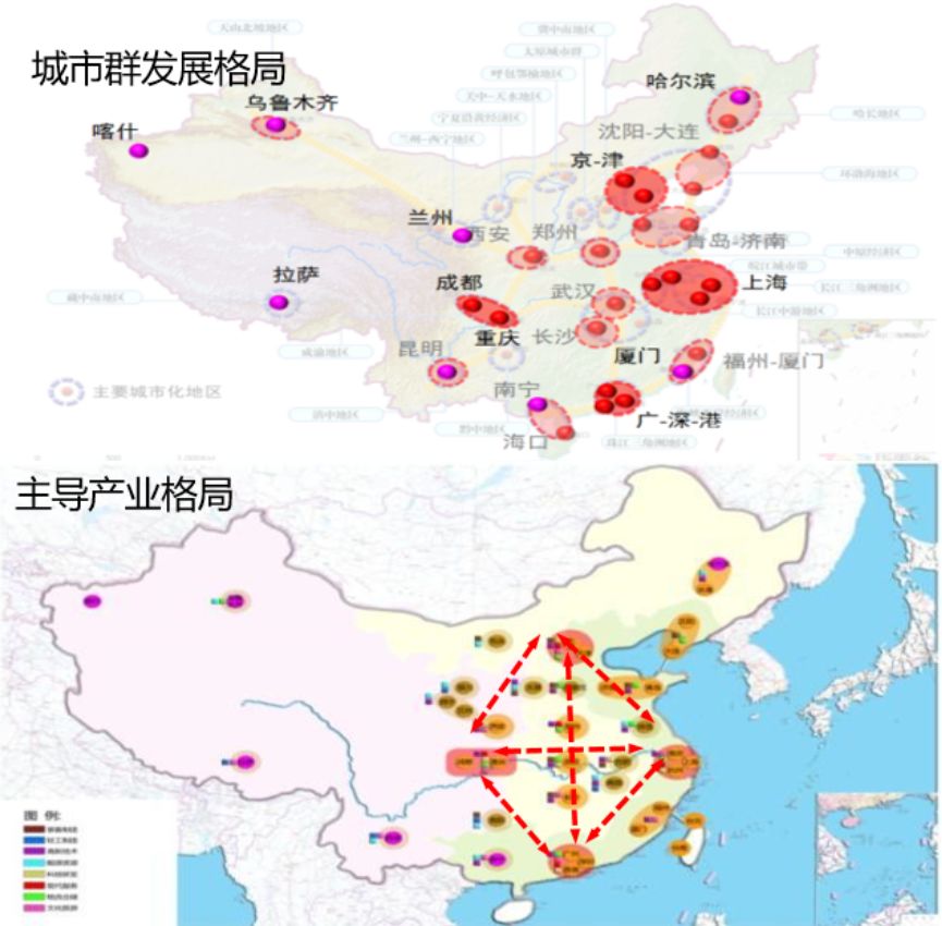回到国家版图,可以看到这样的结构,这是国家通过40多年发展呈现的基本雏形,就是以京津冀、长三角、珠三角、成渝四大中心为代表的人口、产业、资本各方面要素高度集聚的形态,还有中部的长沙、西安、武汉等关键节点。围绕这样的产业格局和城镇布局,要构建以八纵八横为代表的高铁网,包括新的航空网络以及将来新的磁悬浮骨架通道,都需要好好支持,这样才能支撑国家构建形成更加高效连接的全国国土空间格局。这也是我们正在开展的工作。