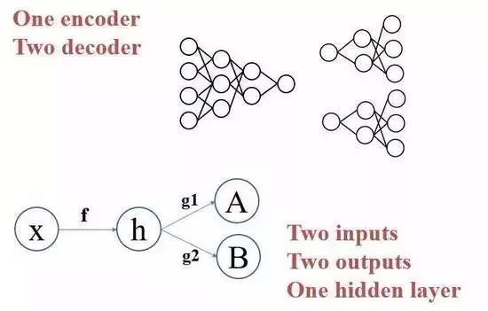 也就是说,既然我们想要将两张脸互换,那么我们可以设计两个不同的解码网络,也就是使用一个编码网络去学习两张不同人脸的共同特征,而使用两个解码器去分别生成他们。