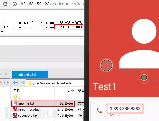 在使用此应用时,我们并未发现什么异常情况,现在我们把视角切换到ubuntu服务器上,这个时候就会发现newfile.txt中多出了一些内容,然后我们访问readinfo.php,就可以看到手机上的联系人信息