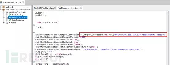 通过分析源码,我们发现代码里有一段发起了网络请求,应用程序在向一个IP为192.168.159.128地址发送信息