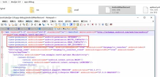0、使用apktool得到AdroidManifest.xml,使用dex2jar得到应用源码