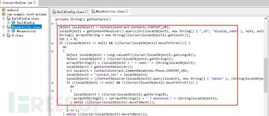 继续阅读源码,我们发现代码里有读取联系人的操作,同时将读取结果拼接到URL参数中向远程服务器发送。