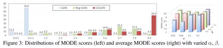 为了研究α和β的影响,在不同的α和β的数值下进行试验(图3右)。结果表明,给定α值,D2GAN可以在β达到一定数值时获得更好的MODE score,当β数值继续增大,MODE score降低。