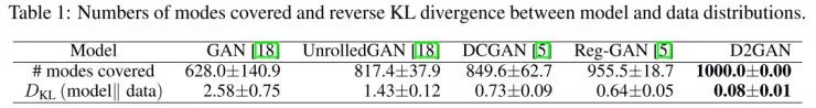在这个实验中,使用一个更强大的模型,鉴别器使用卷积层,生成器使用转置卷积。通过测试模式的数量进行模型的性能评估,其中模型在25,600个样本中至少产生一个模式,同时反KL散度分布介于模型分布(如从预训练的MNIST分类器预测的标签分布)和期望的数据分布之间。表1报告了D2GAN与GAN、unrolledGAN、GCGAN和Reg-GAN之间的对比。通过对比可以看出D2GAN具有极大的优势,同时模型分布和数据分布之间的差距几近为0。