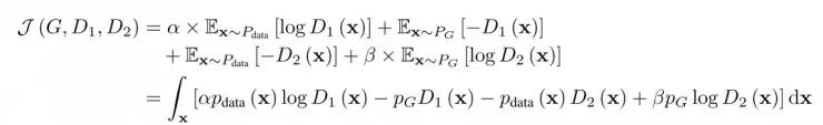 其中超参数为了实现两个目的。第一个是为了稳定化模型的学习过程。两个鉴别器的输出结果都是正的,D1(G(z))和D2(x)可能会变得很大并比LogD1(x)和LogD2(x)有指数性的影响,最终会导致学习的不稳定。为了克服这个问题,降低α和β的值。第二个目的是控制KL和反KL散度对优化的影响。后面介绍过优化方法后再对这个部分进行讨论。