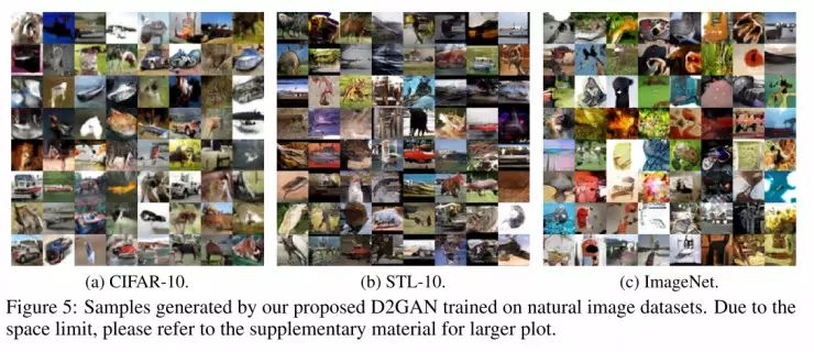作者通过大量的实验对其提出的方法进行了验证。这些实验的结果证实了D2GAN的高效性和扩展性。实验使用的数据库包括合成数据库和大规模真实图片数据库,即MNIST、CIFAR-10,STL-10和ImageNet。相较于最新的基线方法,D2GAN更具扩展性,可以应用于业内最为庞大和复杂的数据库ImageNet,尽管取得了比融合DFM(denoising feature matching)和GAN的方法低的Inception score,但远远高于其他GAN应用的实验结果。最后,作者指出,未来的研究可以借鉴融合DFM和GAN的做法,在现有的方法基础上增加类似半监督学习、条件架构和自动编码等的技术,更进一步的解决生成对抗网络在应用中的问题。