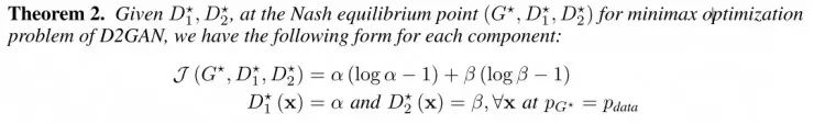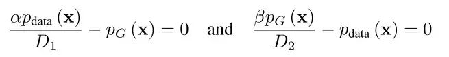 分别是KL和反KL散度。这些散度通常是非负的,并且只在PG*=Pdata时等于0。换言之,生成器生成的分布PG*与数据分布完全等同,这就意味着由于两个分布的返回值都是1,两个鉴别器在这种情况下就不能分辨真假样本了。