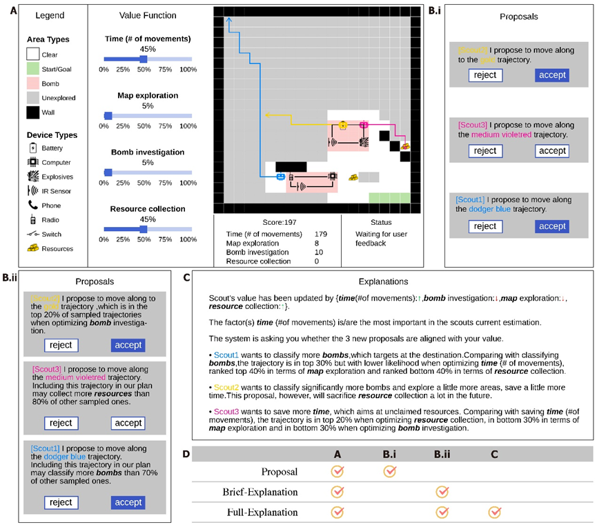 在不清楚人类指挥官价值取向的情况下,机器人侦察兵小队必须快速推断出人类的价值判断,在每一步行动中,机器人侦察小队每一个成员都要给出下一步行动方案,由人类指挥官选择。为了帮助指挥官进行决策,侦察机器人小队将解释行动方案的依据。结合指挥官的反馈,以往的互动历史和当前的地图情况,侦察机器人小队将调整其对指挥官当前价值观的判断,并采取相应的行动。