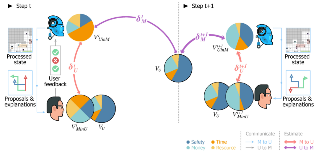 在本文提出的系统中,机器人提出任务计划的建议,并要求人类用户给出反馈(接受或拒绝建议),从人类反馈中推断出任务目标背后人类真实的价值意图。在协作游戏中,如果用户知道机器人正在积极学习他的价值目标,那么用户就会倾向于提供更加有用的反馈,以促进价值保持对齐。特别地,每条信息都传达了两方面的意义,包括(1)基于价值目标的语义信息和(2)基于不同解释方式之间区别的语用信息。利用这两方面的含义,XAI 系统以一种多轮的、即时的方式展示了价值的一致性,在一个问题搜索空间大的团队合作任务中实现了高效的人机互动交流。为了使机器人的价值目标与用户保持一致,XAI 系统生成解释、揭示机器人对人类价值的当前估计、并证明提出规划的合理性。在每一步的互动中,为了避免解释内容过于冗长,机器人会提供定制化的解释,比如省略重复的已知信息并强调重要的更新。在收到机器人的解释并向它们发送反馈后,用户向机器人提供提示,说明他们对最新建议和解释的满意程度。利用这些反馈,机器人会不断地更新解释的形式和内容。