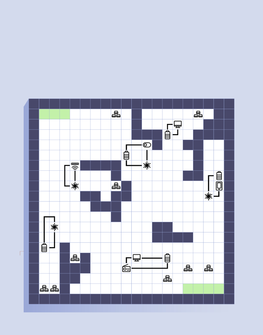 如图 2 所示,在我们设计的合作游戏中,包含一个人类指挥官和三个侦察机器人。游戏的目标是需要在一张未知的地图上找到一条从基地(位于地图的右下角)到目的地(位于地图的左上角)的安全路径。该地图被表示为一个部分可见的 20×20 网格图,每个格子都可能有一个不同的装置,只有在侦察机器人靠近它之后才可见。