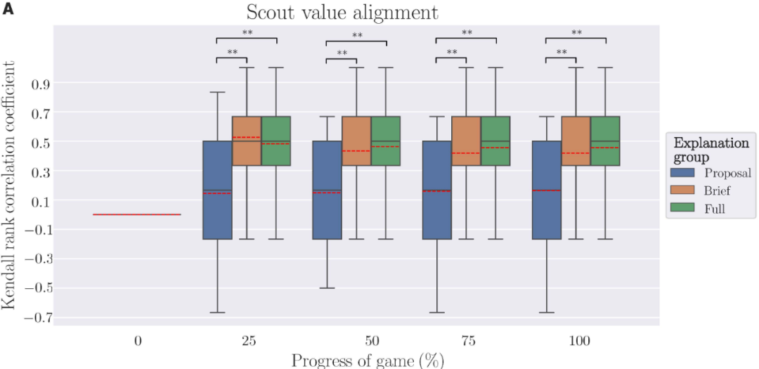 本文提出的 XAI 系统成功地证明了双向人机价值对齐框架的可行性。从倾听者的角度来看,所有三个解释组中的机器人都可以在游戏进度达到 25% 时,通过对至少 60% 的目标重要性进行正确排序,快速与用户的价值进行对齐。从表达者的角度来看,通过提供适当的解释,机器人可以向用户说明其意图,并帮助人类更好的感知机器人的价值,当给机器提供”完整解释 “时,只需在游戏进度达到 50% 时即可实现人类用户价值与机器人价值的统一,而当只提供” 简要解释“时,游戏进度需要达到 75% 时才能完成价值的统一。