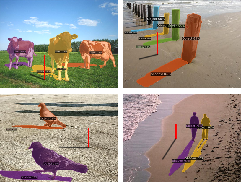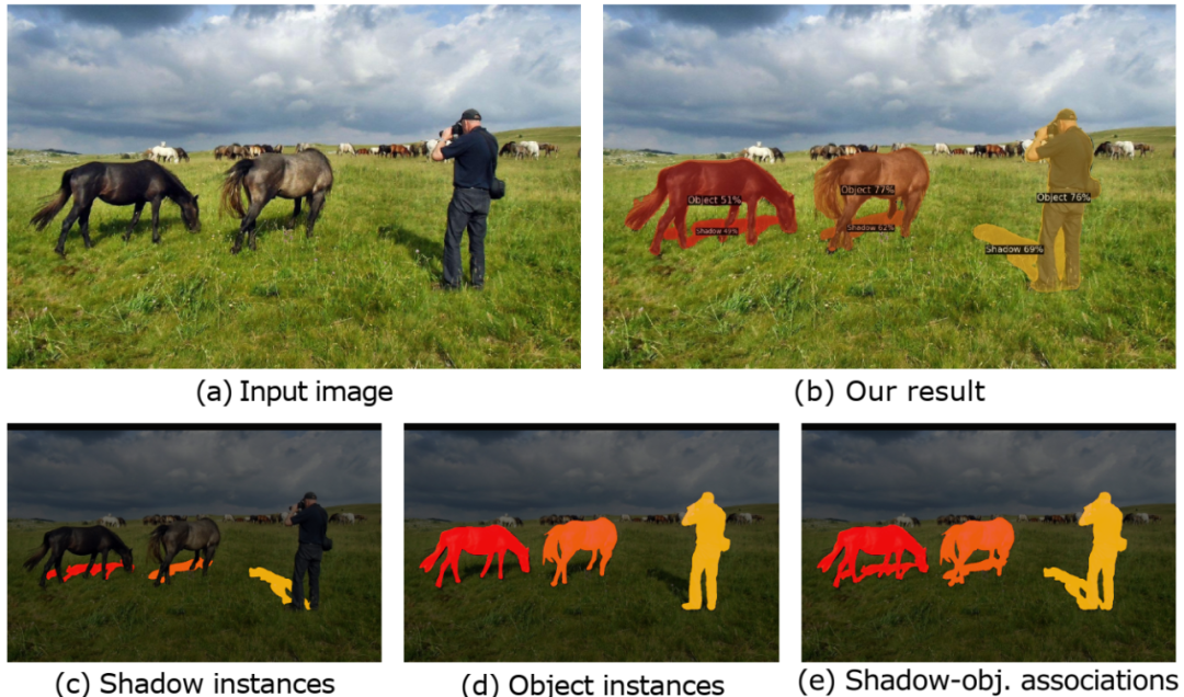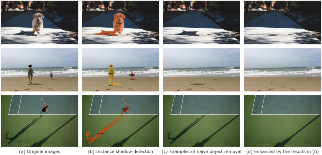 实例阴影检测不仅可以找到输入图像中的单个阴影实例,还可以得到投射每个阴影的物体。实例阴影检测任务有助于各种下游应用,例如删除、缩放或移动物体和其投射的阴影,估计光照的方向,帮助生成 AR 场景中虚拟物体的阴影,以及根据在卫星图像中检测到的阴影和物体实例推测物体的高度等。