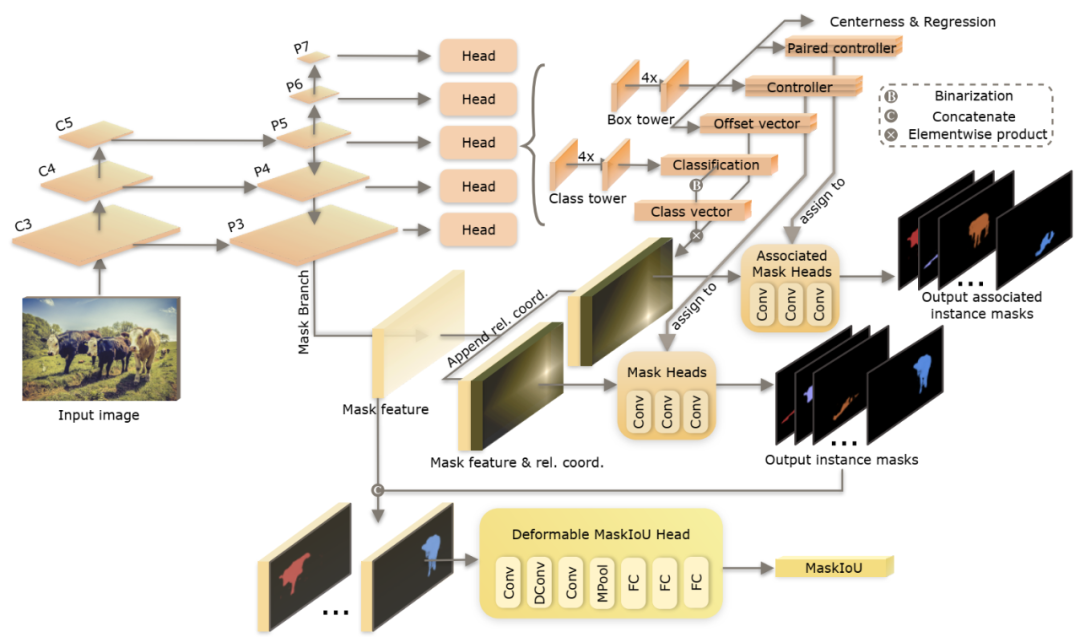 其中,Mask Head/Associated Mask Head 的卷积参数分别来自于上面提到的控制器和配对控制器。最后,该方法将预测的实例掩膜与掩膜特征连接起来,并设计了一个可变形的 MaskIoU Head 来减少低质量但置信度高的实例掩膜。
