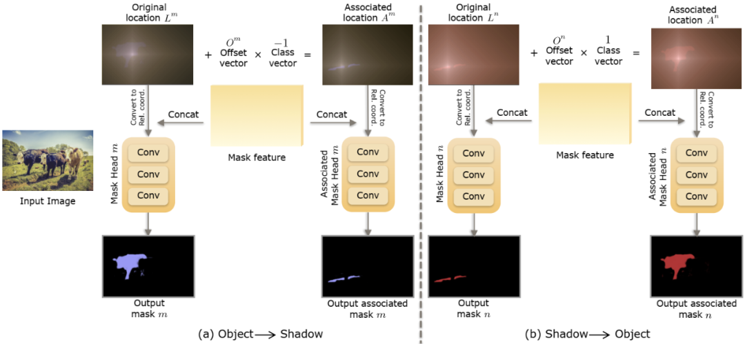 该研究设计了用于直接学习阴影与物体关系的单阶段实例阴影检测框架,方法仅包含卷积操作,用于生成任意形状的阴影 / 物体 / 阴影 - 物体掩膜。为了实现这个目标,该研究设计了双向关系学习模块,寻找阴影 - 物体关联对。该模块针对每一个阴影 - 物体关联生成一个偏移向量,表示从阴影实例中心到物体实例中心的方向或者从物体实例中心到其对应的阴影实例中心的方向。同时,该方法生成一个类向量用于表示上述学习的方向。