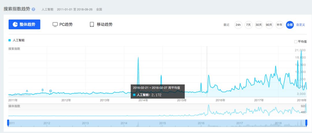 2016 年开始,从百度搜索指数来看,人工智能一词热度开始居高不下,一场来自人工智能与顶尖围棋选手的战斗也带来了一场技术风潮的崛起。而细究之下,云计算、物联网、5G、大数据等不同的技术也都在此过程中起到不可忽视的推动作用。AI 已经不再是当年的规则下的小丑,而在人类引以为傲的智力游戏中脱颖而出,AI 的能力终于开始被正视。