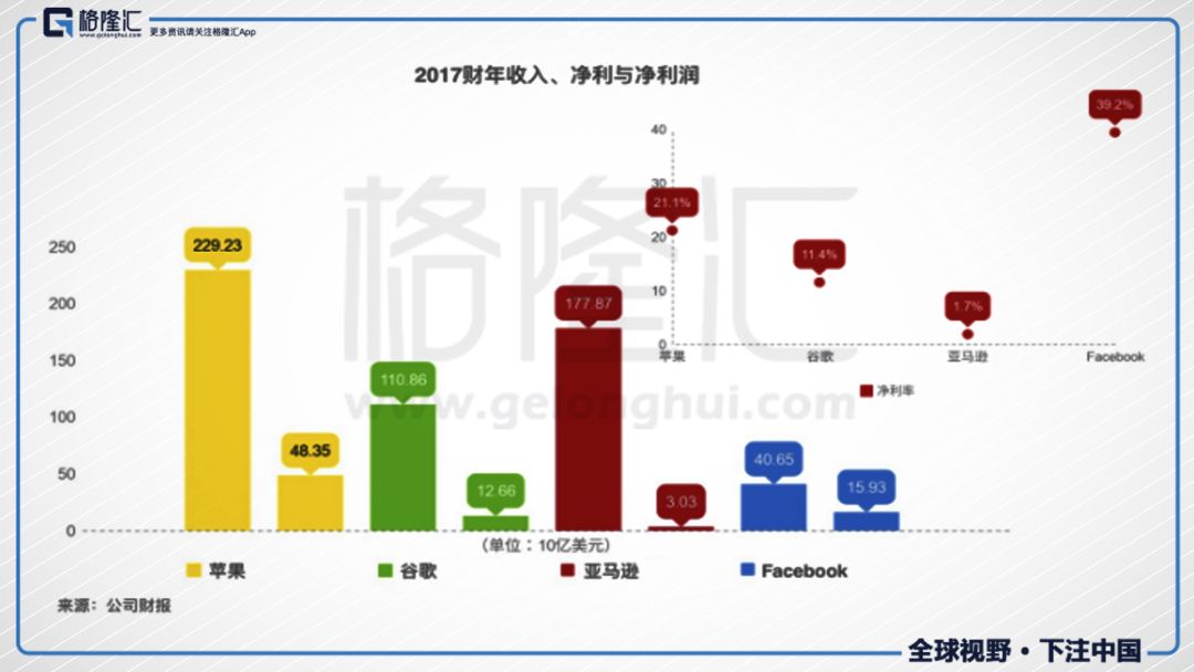 裹挟iPhone X的爆款效应,苹果收入环比增长13%至882.9亿美元,利润第一次达到200亿美元关口;谷歌的收入在过去的32个季度里持续保持平均20%以上的增长,至302亿美元;亚马逊收入跳涨38%至605亿美元,破天荒第一次给出超过10亿美元的利润;Facebook收入上扬47%,至129.7亿美元。