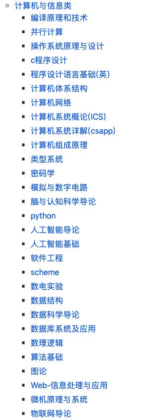 我们可以看到当前的课程目录包括编译原理和技术、并行计算、操作系统原理与设计、c程序设计、程序设计语言基础、计算机体系架构、计算机网络、计算机系统概论(ICS)、计算机组成原理等基础课程此外,还有 Python、人工智能导论、人工智能基础、算法基础等人工智能相关的内容。