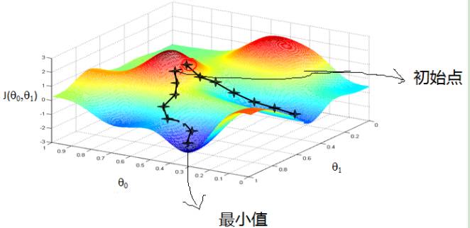 比如我们在一座大山上的某处位置,由于我们不知道怎么下山,于是决定走一步算一步,也就是在每走到一个位置的时候,求解当前位置的梯度,沿着梯度的负方向,也就是当前最陡峭的位置向下走一步,然后继续求解当前位置梯度,向这一步所在位置沿着最陡峭最易下山的位置走一步。这样一步步的走下去,一直走到觉得我们已经到了山脚。当然这样走下去,有可能我们不能走到山脚,而是到了某一个局部的山峰低处。