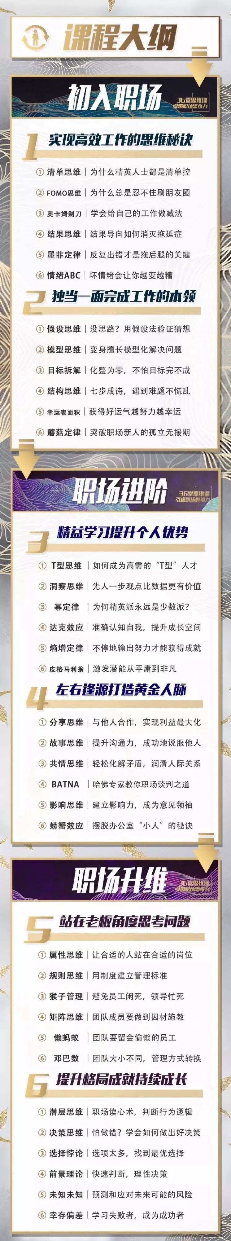 课程不仅包含清单思维、蘑菇定律、T型思维、螃蟹效应、猴子管理等36个职场思维,还有解决职场难题的实操方法,教你获得黄金人脉、提升工作效率,助你升职加薪。