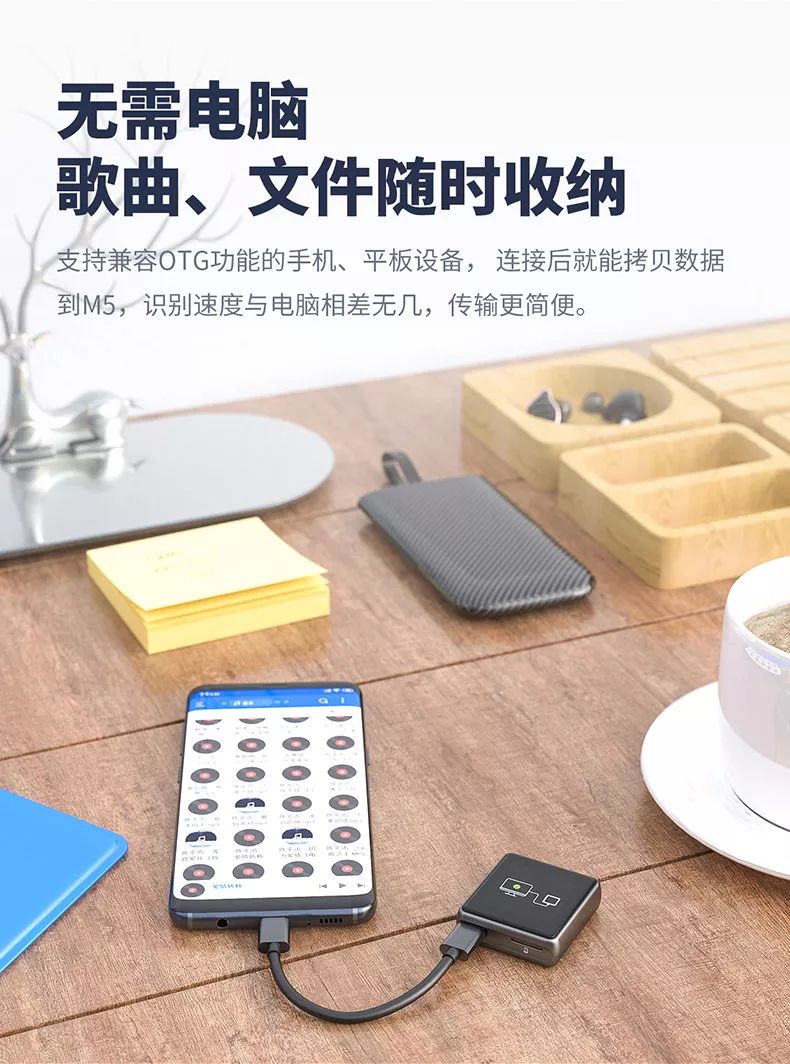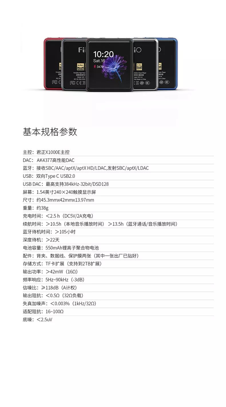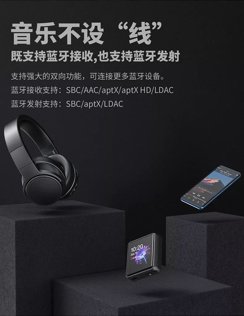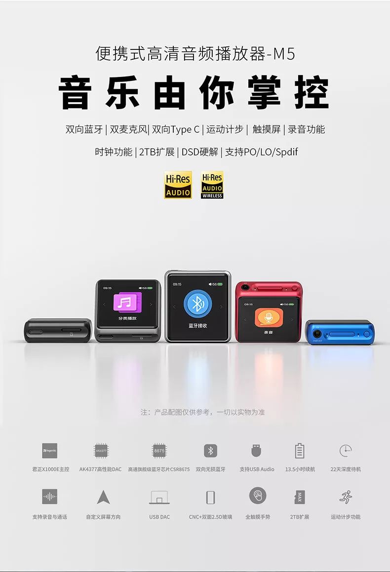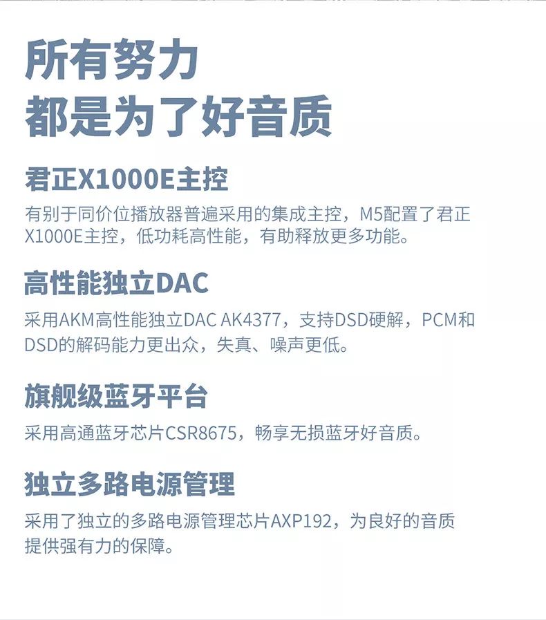 精巧随身,功能丰富。作为音乐播放器而言,M5的硬件配置十分出色,君正X1000E主控+高通旗舰级蓝牙平台CSR867+高性能独立DAC AK4377的强强组合,使M5在音质和功能上都得到了出色的表现,不仅支持aptX/LDAC双向蓝牙,还拥有语音通话、高清录音、运动计步等实用功能。作为可穿戴式设备而言,M5小巧的机身拥有背夹和表带两种佩戴方式,大大丰富了使用场景。触摸+手势+按键操作无论何种场景下体验都十分灵敏,既丰富我们的日常生活,也将音频体验提升到每一个角落。