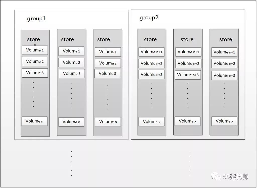 Store模块是WOS的实际存储模块,整体的设计思路参照了haystack论文,不同的是,WOS的store中负责存储的needle可能是一个完整的小文件也可能是一个大文件的一个分片,以needle为单位合并到磁盘上的一个大文件中,这个大文件我们称之为volume。每个store管理多个不同的volume 。WOS将store用group进行分组,每个group下包含多个互为备份的store,实际部署时通常为3备份,每个store部署不同机器的一个独立的磁盘空间,便于管理和维护,具体逻辑关系如下图所示: